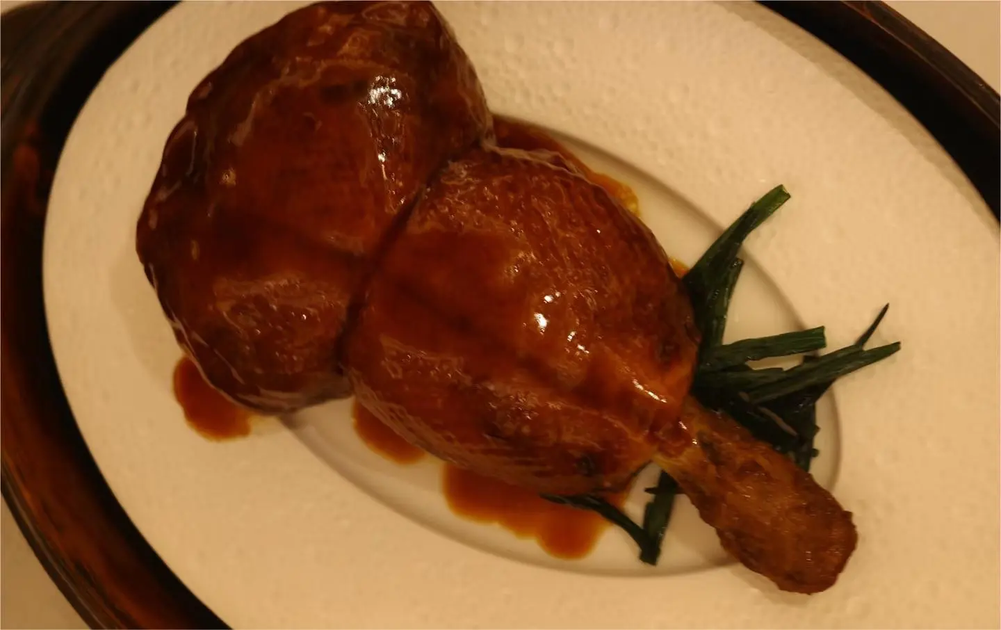 A whole duck is deboned, packed with the filling, sealed with bamboo skewers, and steamed for hours until the meat is as tender as silk. The final step—pouring a glossy reddish-brown sauce over the dish—turns it into a banquet centerpiece.